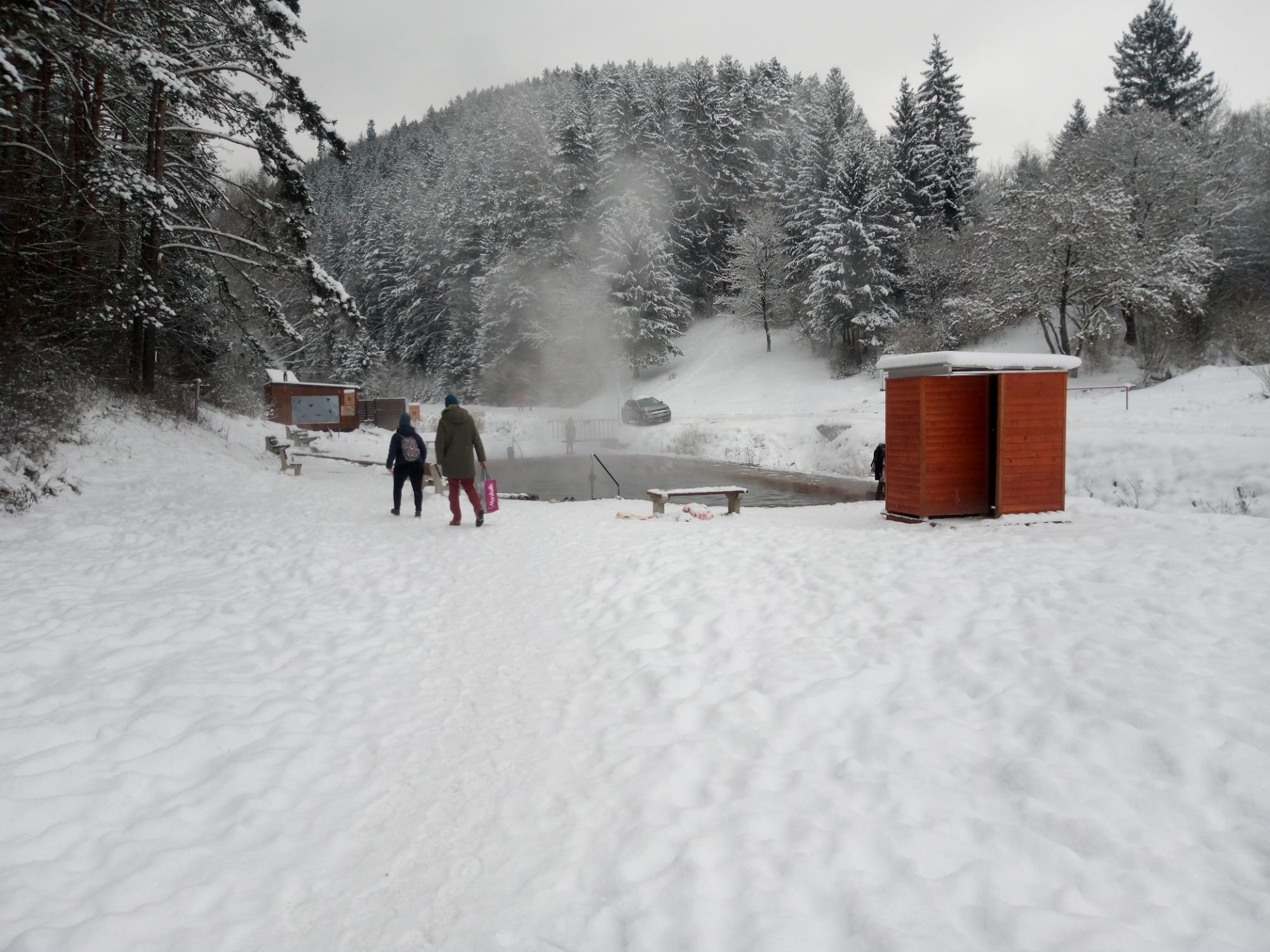 Den Rest des Abends machte ich ruhig – bis ich durchdrehende Räder hörte und sah, dass sich ein Auto festgefahren hatte. Alle halfen mit, und das Auto kam wieder frei. Anschließend kam ich mit den anderen, die ebenfalls auf dem Parkplatz standen, ins Gespräch. Nach einem gemeinsamen Schnaps genoss ich die Ruhe, bis 23:45 Uhr. Dann ging ich mit meinem Bier ins Wasser. Vielleicht noch zehn Leute waren da. Um Mitternacht zündeten einige Wunderkerzen an. Der Dampf verstärkte Licht und Stimmung, und Richtung Sauna gab es ein kleines Feuerwerk. Nichts Großes, nichts Wildes. Aus dem Dorf sah man gelegentlich Lichtblitze in den Wolken. In der Slowakei ist Feuerwerk nur zwischen 18 und 2 Uhr erlaubt, laute Böller sind generell untersagt – und scheinbar funktioniert das ganz gut.